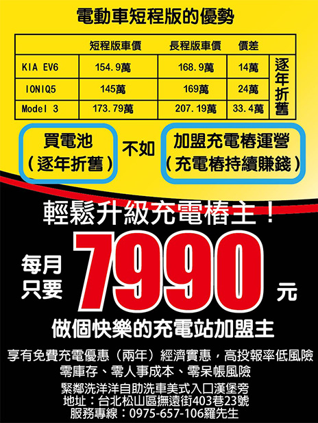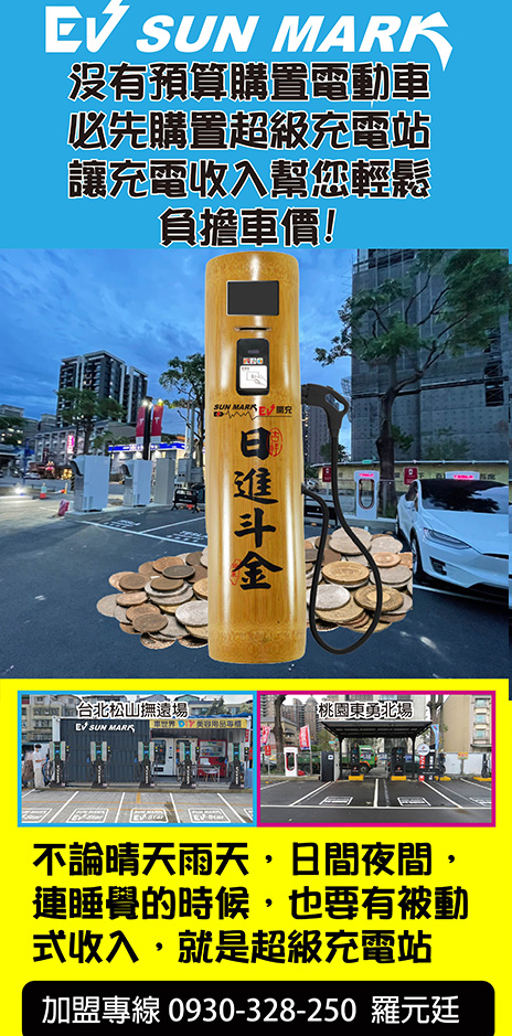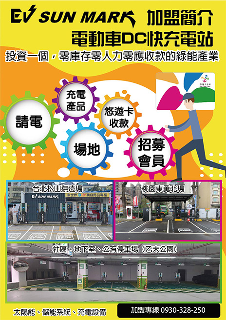 EV Sun-Mark 充電樁設置加盟,電動車DC快充站,投資一個,零庫存、零人力、零應收款的綠能產業,可增設太陽能儲能系統、充電設備,加盟專線0930-328-250